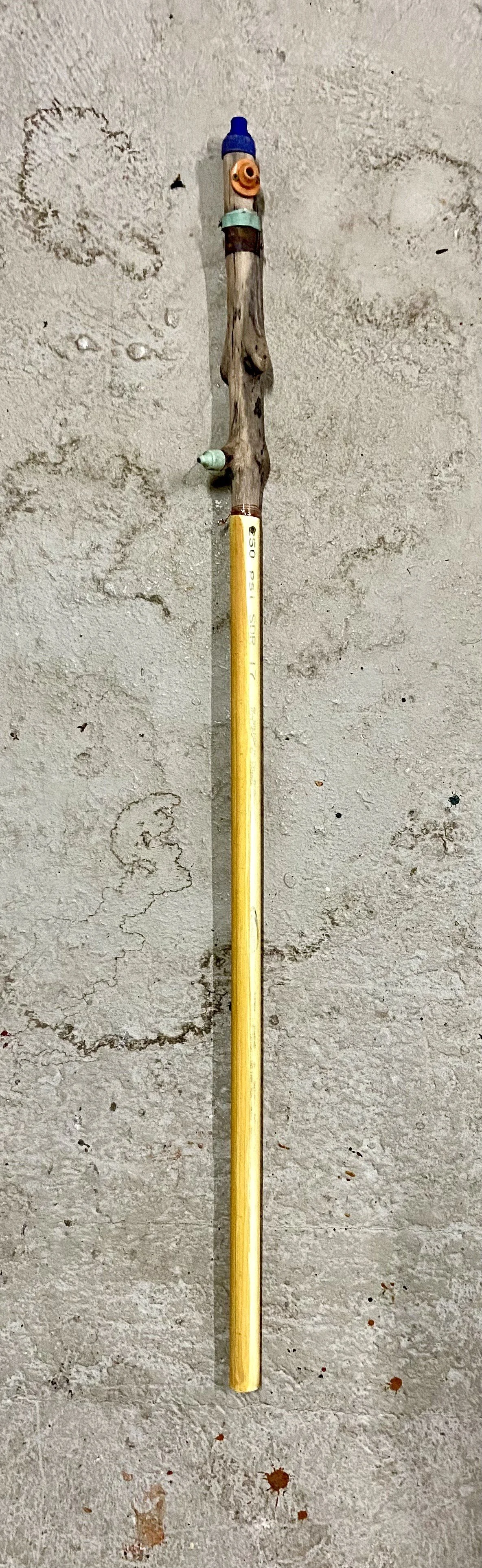Simón Vega: Sunset-light saber Trash Wars series (2024) Driftwood, painted pvc tube, found rubber, metal and varnish, 110 x 3.5 cm. / 43.30 x 1.37 in.. $1,500 USD