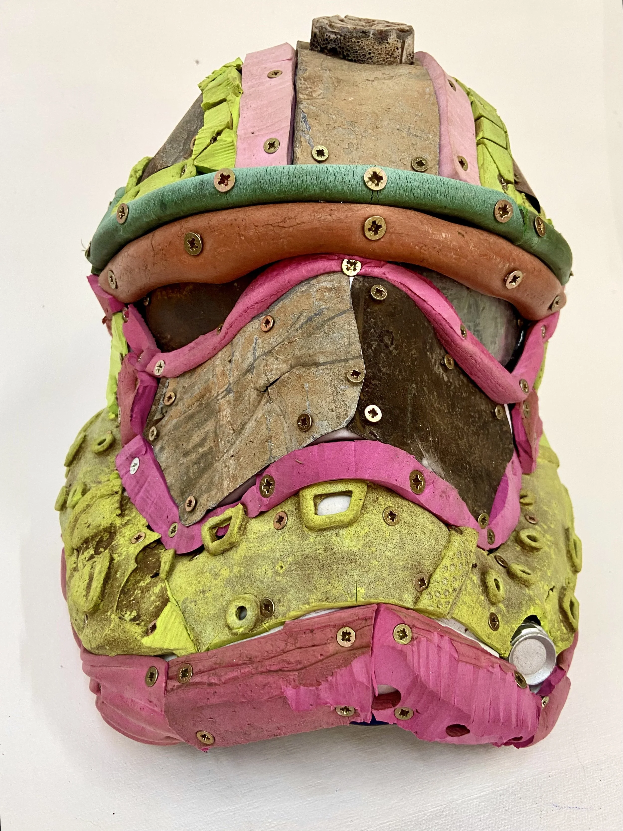 Simón Vega: Storm Beach Trooper Trash Wars series (2024) Plastic mask, found rubber sandals, metal and hoses, wood and aluminum, 30 x 27 x 26 cm. / 11.81 x 10.62 x 10.23 in. SOLD