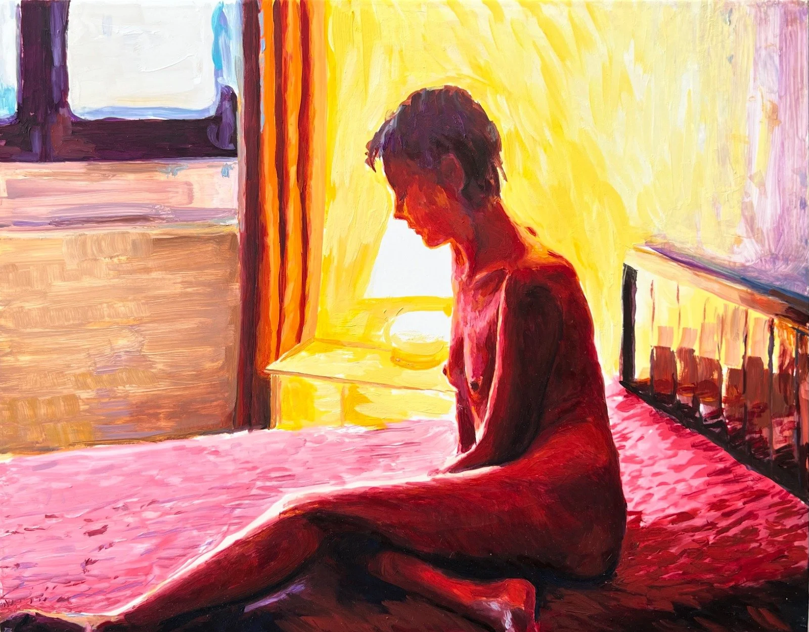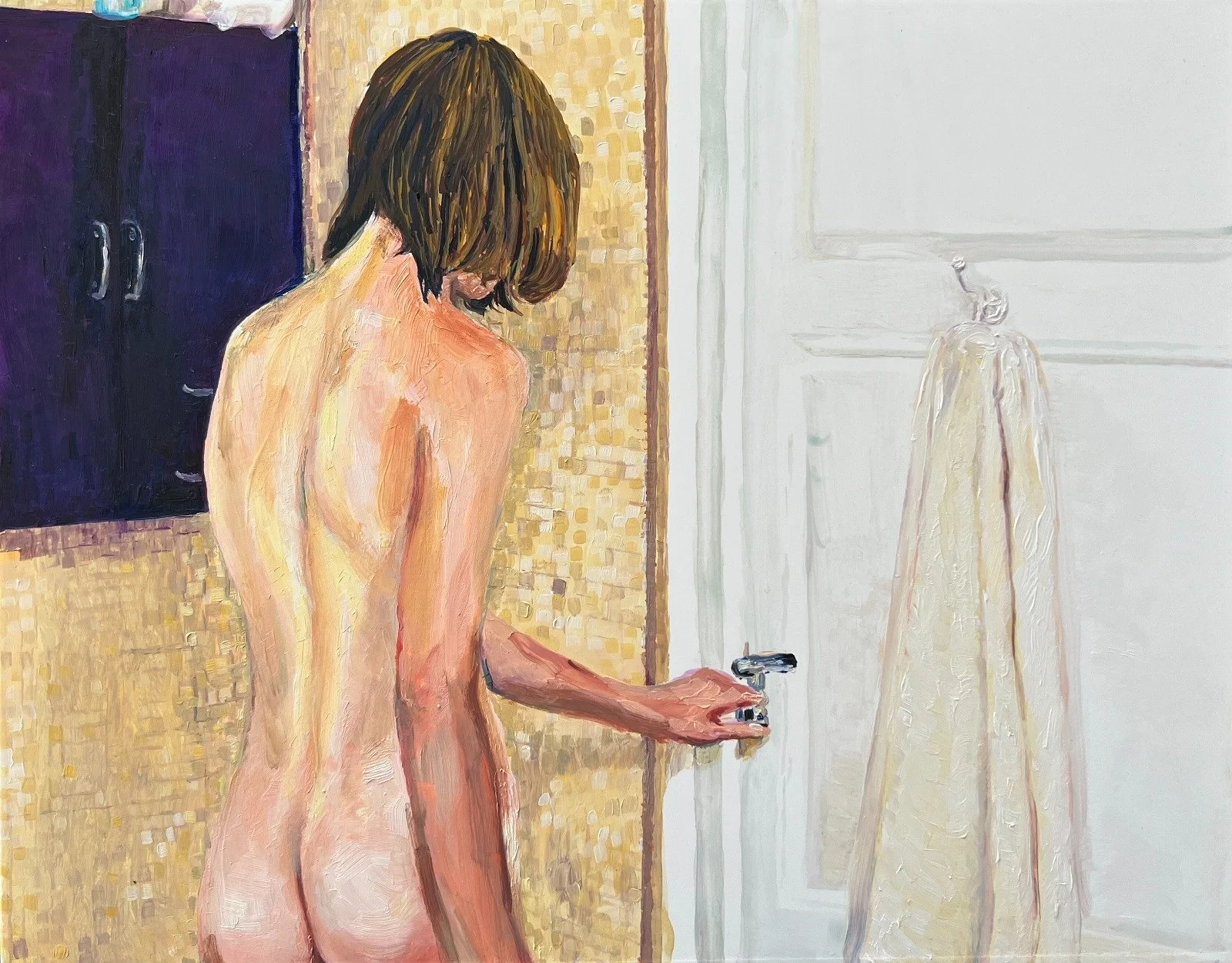 Boris Torres: Antoine in the bathroom (2023), oil on panel, 10 x 14 inches