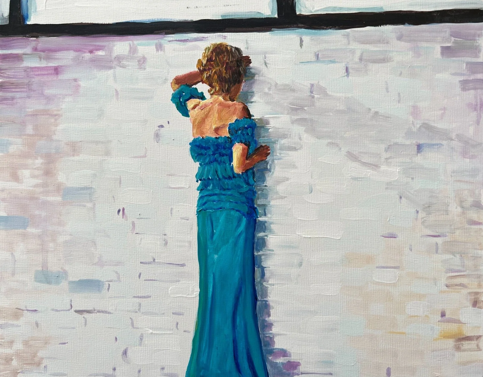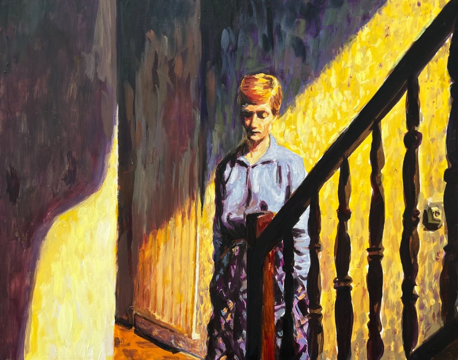 Boris Torres: Isabelle by the stairs (2023), oil on panel, 10 x 14 inches