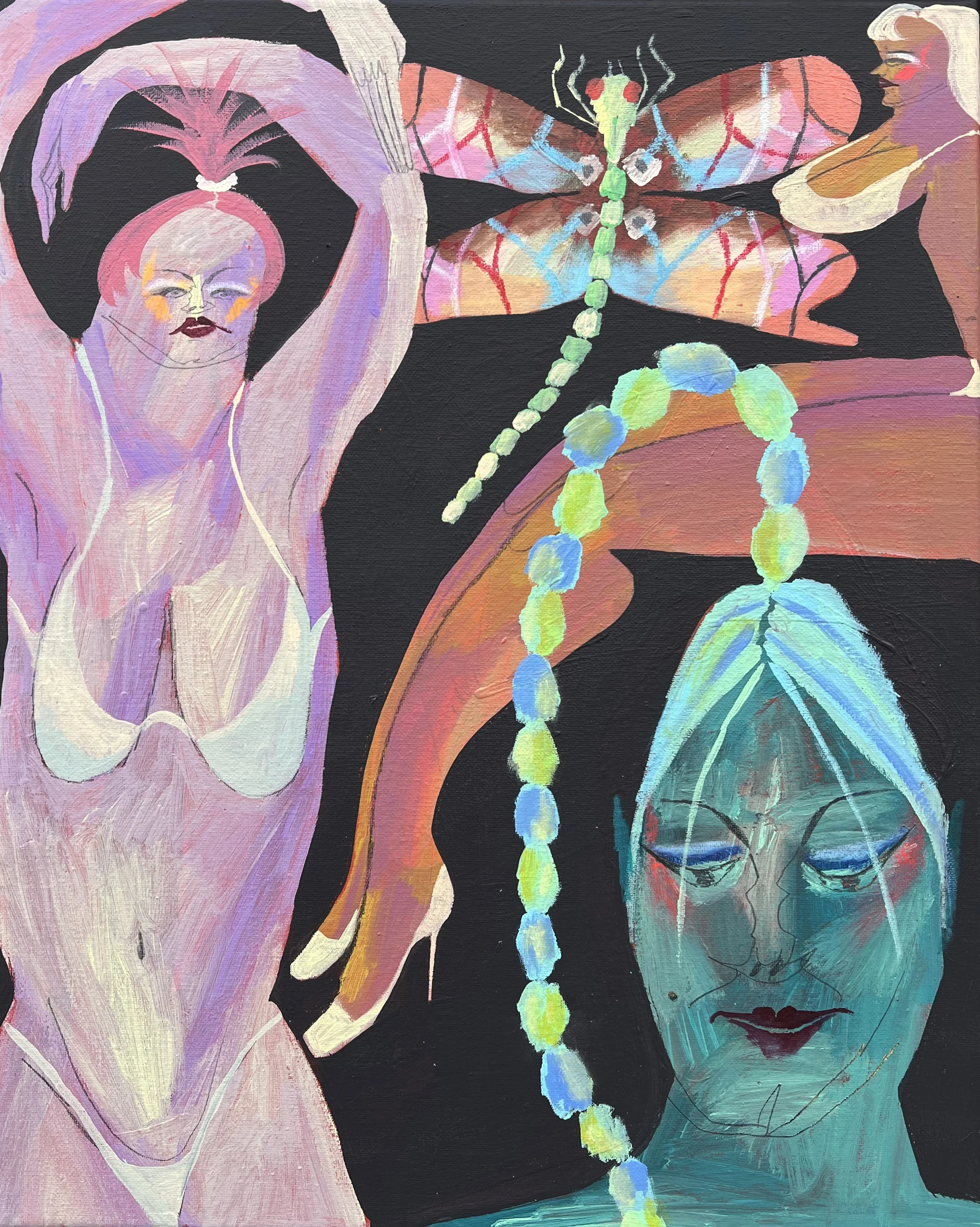 Kevin Sabo, Ladywhispers to a Dragonfly, 2023, Acrylic, pencil and oil pastel on canvas, 20x16 in $2500USD