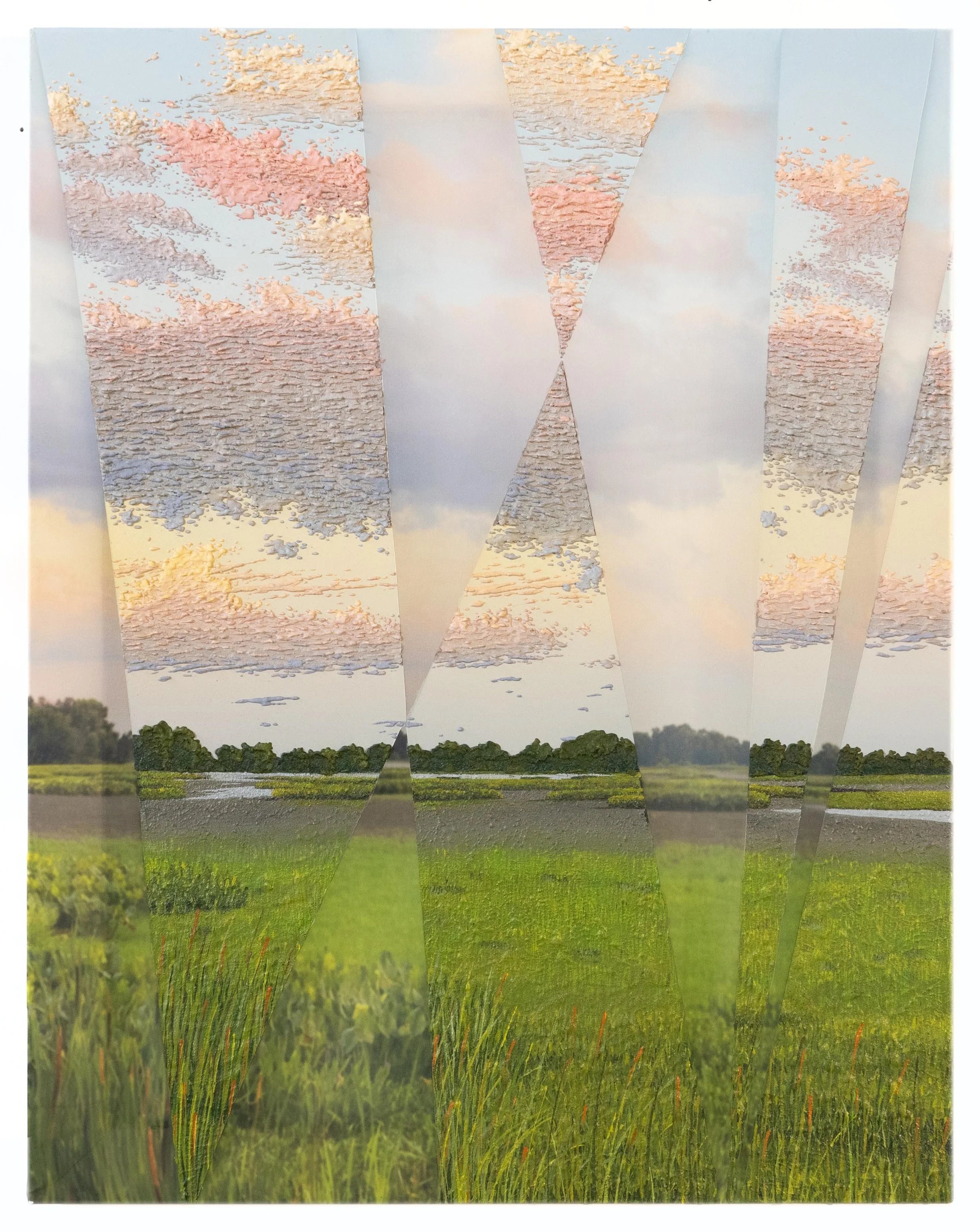 Saskia Fleishman: John Heinz National Wildlife Refuge June 29, 2025, 8:25pm (2025) Acrylic and locally sourced sand on digitally printed chiffon, 39 x 31 inches, $6,000 USD