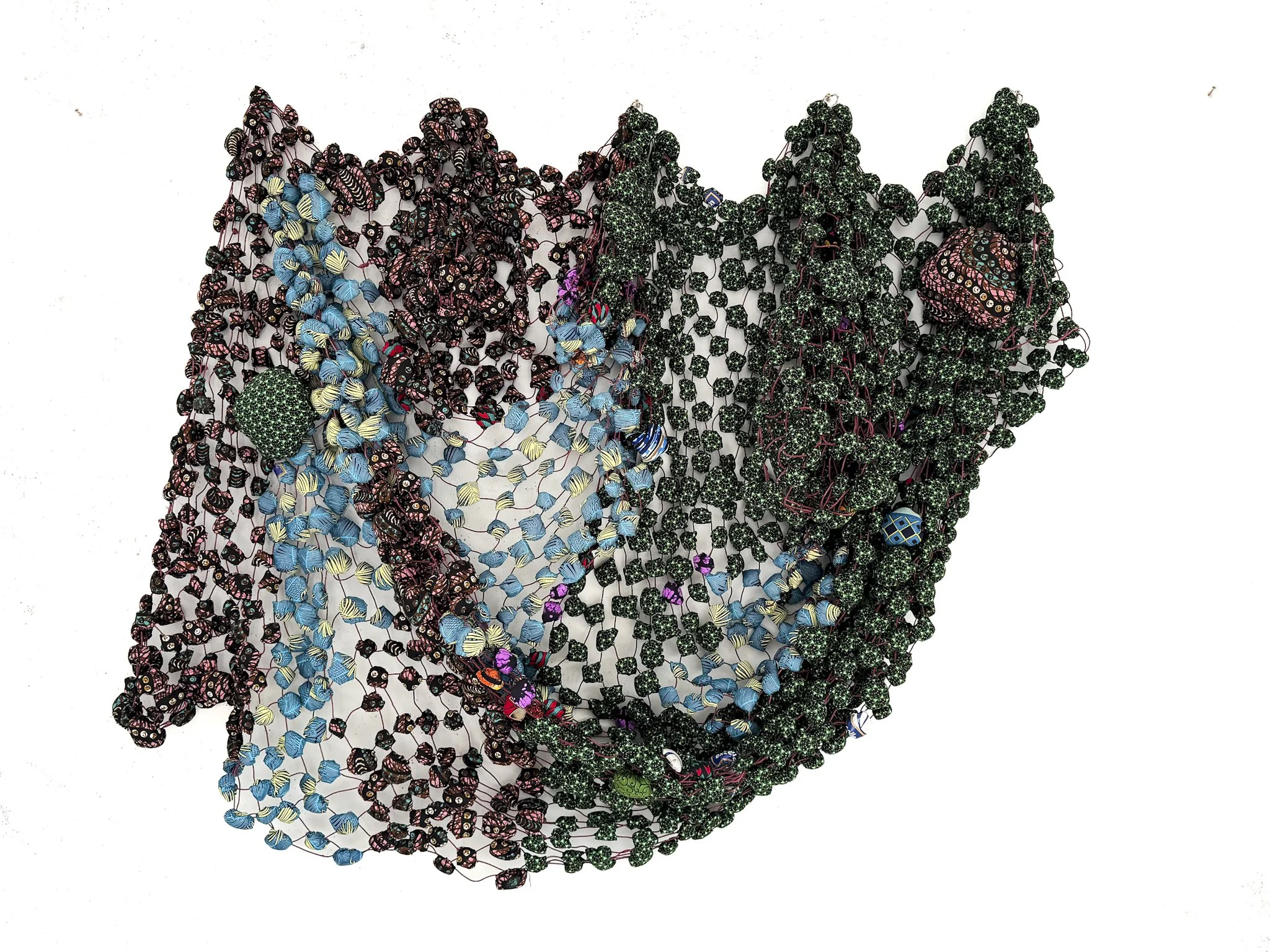 Samuel Nnorom: Eventually it’ll Get Greener (2025) African Print Fabric, 166 x 206 x 25 cm. / 65.35 x 81.10 x 10.23 in. $16,000 USD