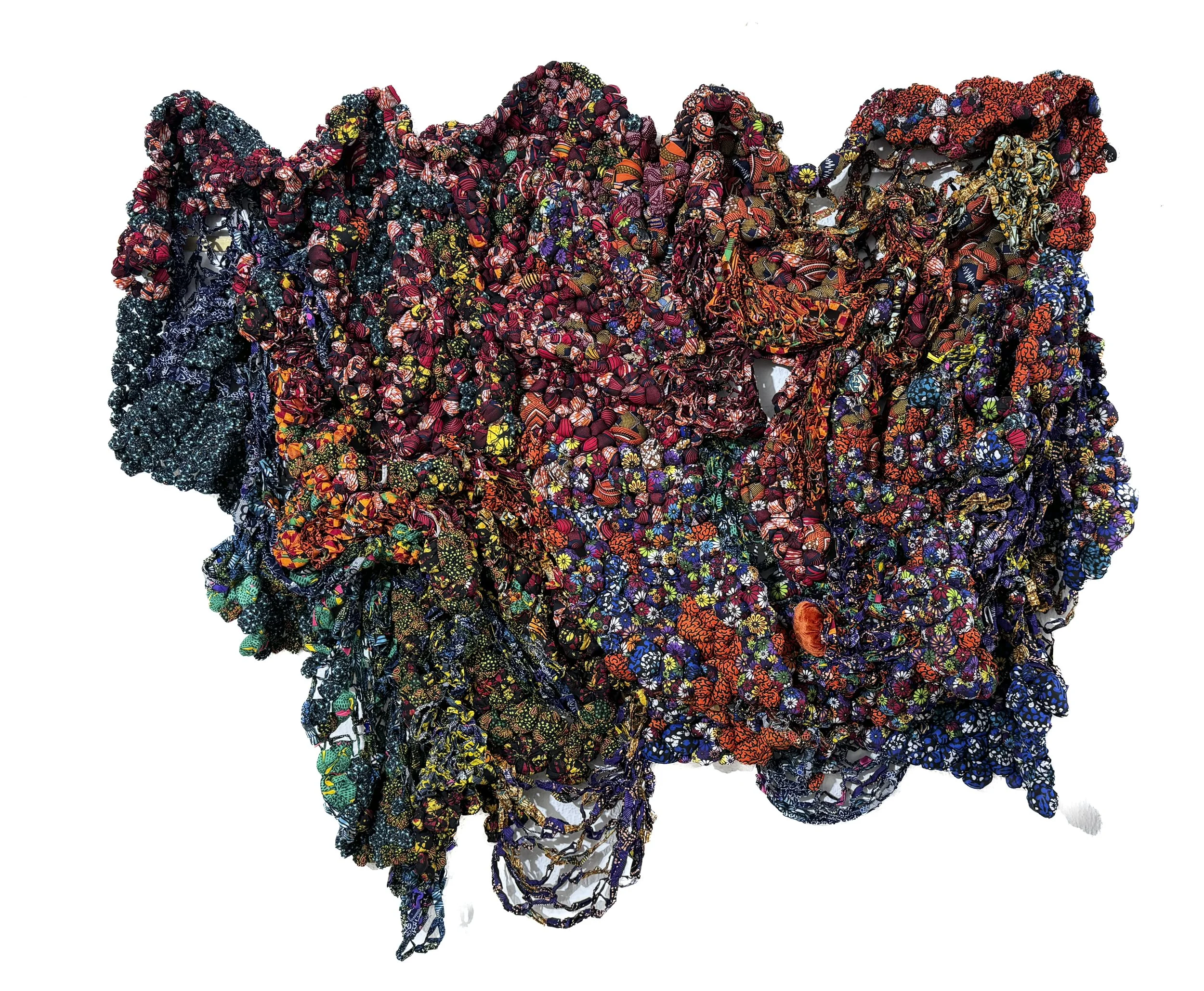 Samuel Nnorom: Suddenly the Flow (2024), African Print Fabric, 165 x 126 x 27cm. / 65 x 9.6 x 10.6 in. $11,000 USD